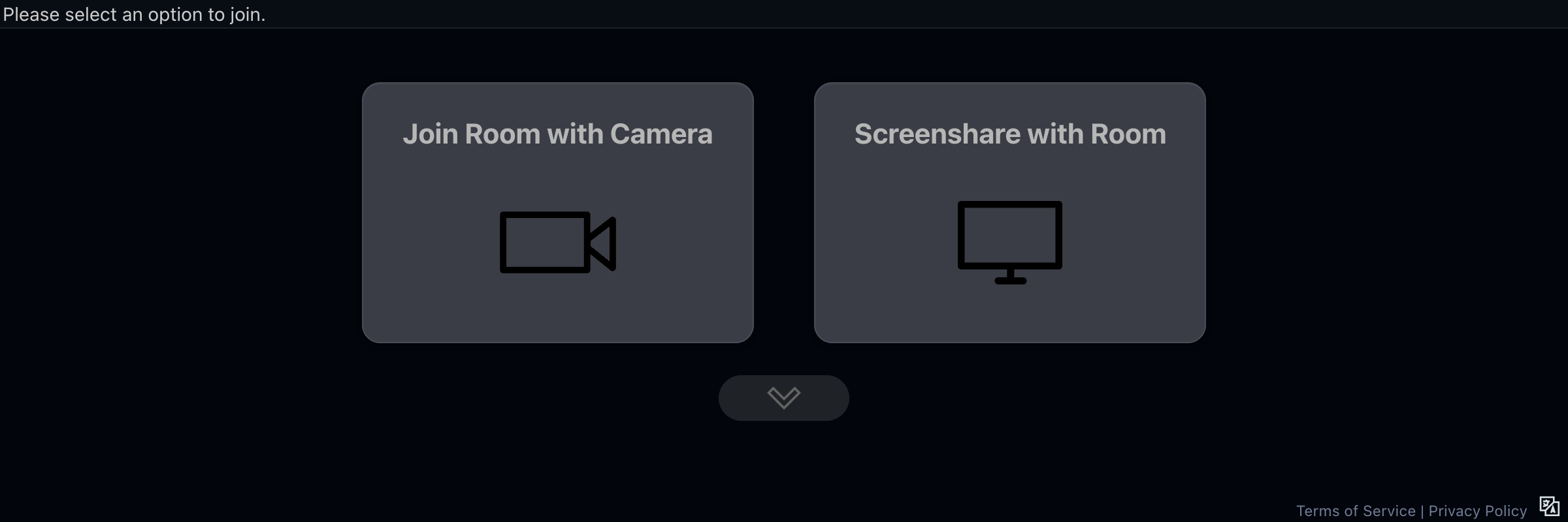 話者の映像と音声の配信・Keynote スライドの配信は、ブラウザで指定された VDO.Ninja のURLにアクセスして設定します。ページを開くと、真っ黒い画面に2つの大きなボタンがあります。左側の「Join Room with Camera」がカメラ映像の配信、右側の「Screenshare with Room」がPC画面の配信です。わかりやすいですね。