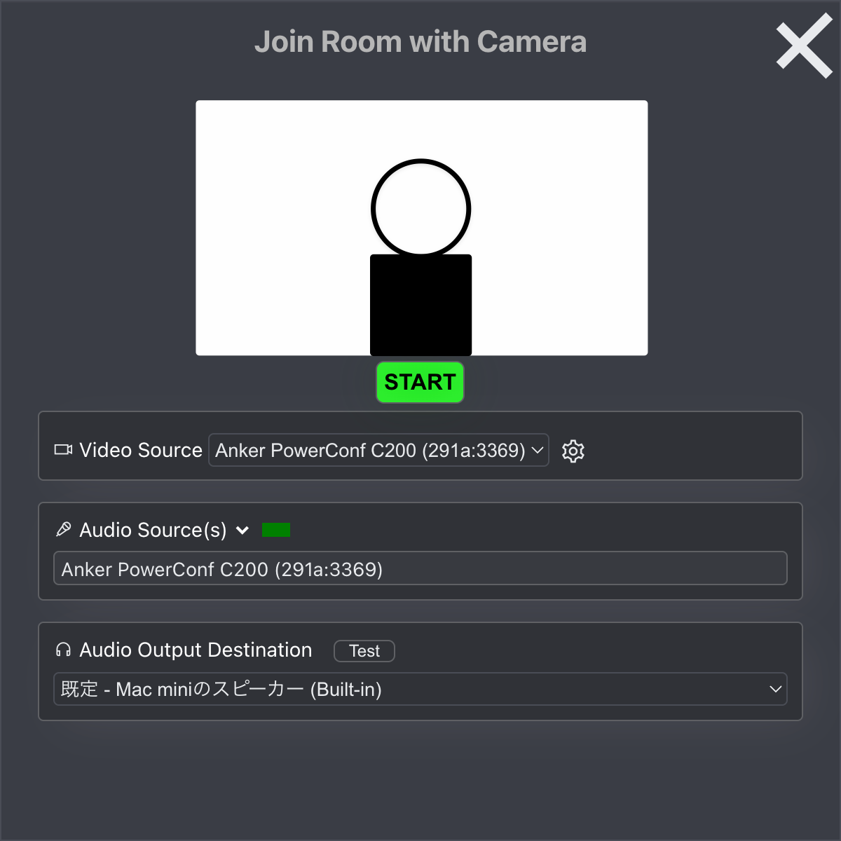 「Join Room with Camera」を選ぶと、下のような画面になります。上にプレビューがでてきて、下でVideo・Audio・Audio Outputの機材を指定するだけです。