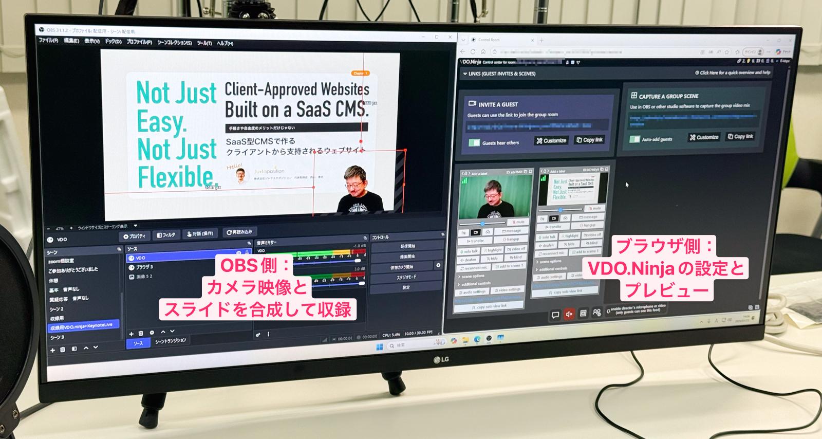 モニター左側にある OBS で、西山さんから送られてきたカメラ映像とスライド映像を配置し、色や音声などの微調整を行い、録画します。右側は VDO.Ninja の設定とプレビューの画面です。